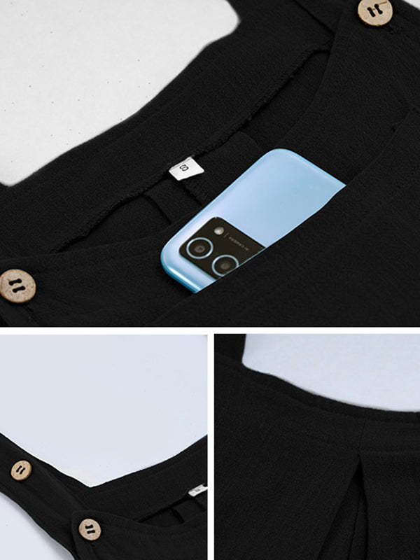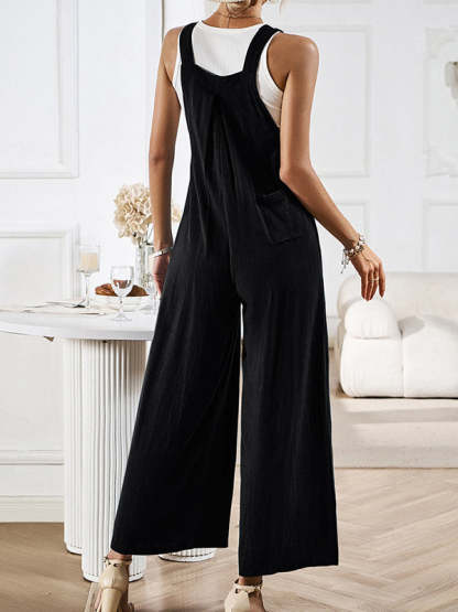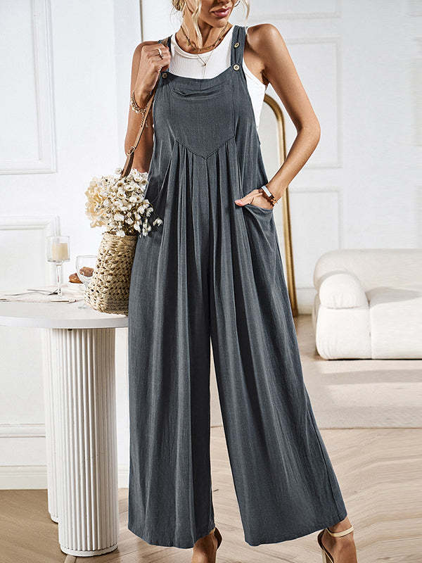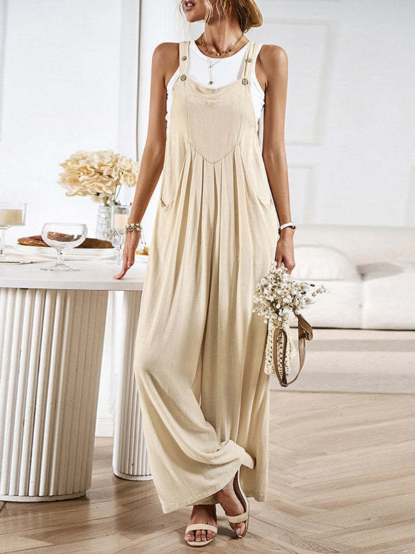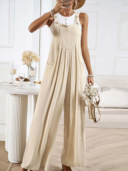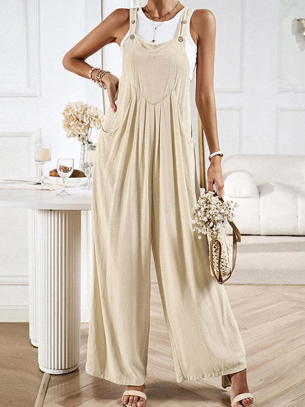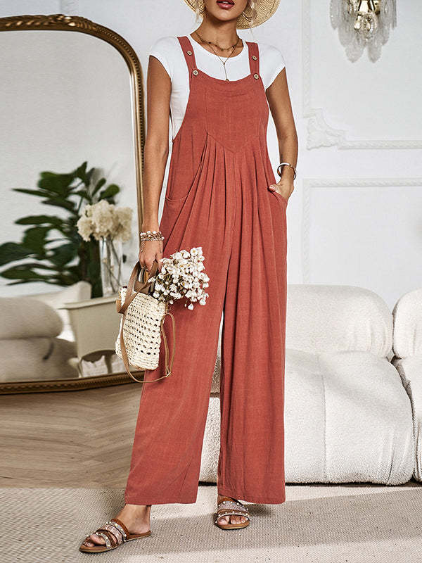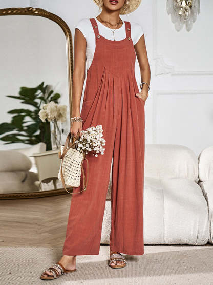 Loose Sleeveless Pleated Pockets Split-Joint Spaghetti-Neck Overalls