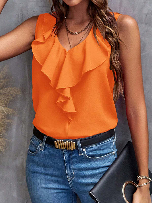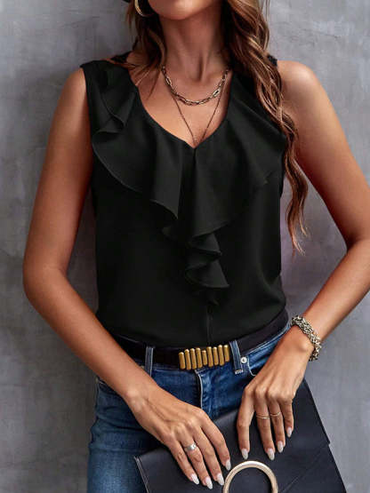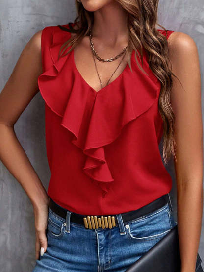 Loose Sleeveless Ruffled Solid Color V-Neck Vest Top