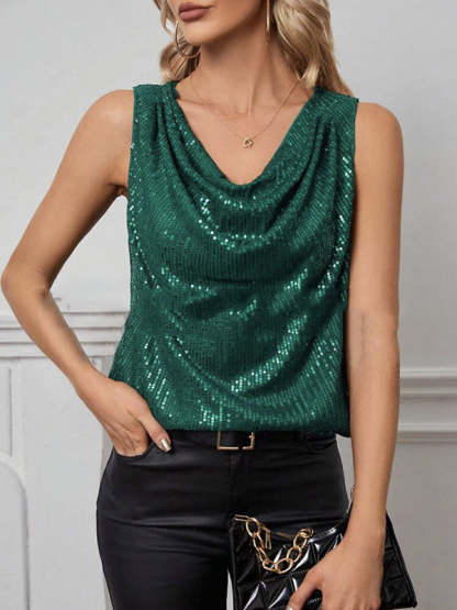 Loose Sleeveless Sequined Shiny Solid Color Split-Joint V-Neck Vest Top
