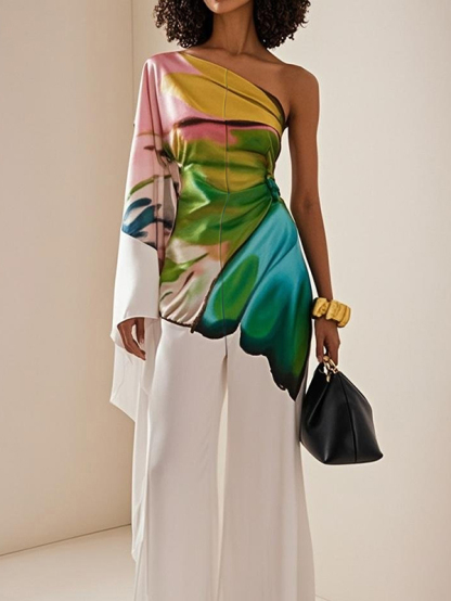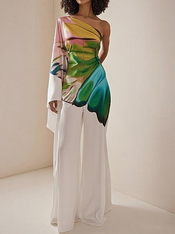 Long Sleeves Loose Flower Print Pleated Pockets One-shoulder Jumpsuits