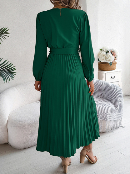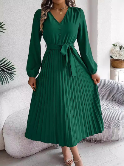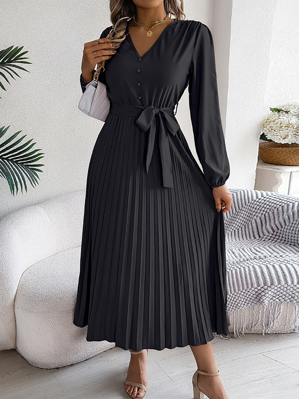 Solid Color Pleated Buttoned Belted Puff Sleeves Long Sleeves V-Neck Maxi Dresses