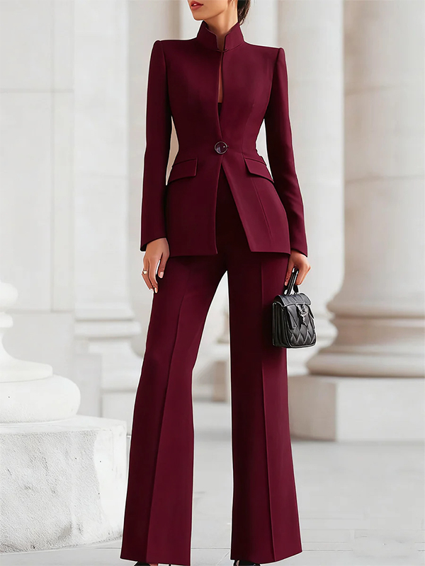 Solid Color Pockets Buttoned Long Sleeves Stand Collar Outerwear Blazer