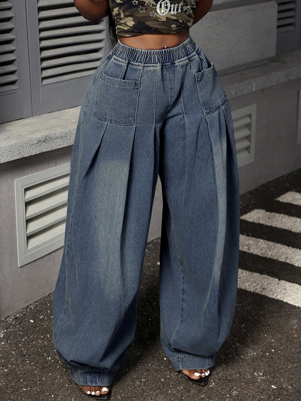 Solid Color Pockets Elasticity Loose Trousers Jean Pants Bottoms