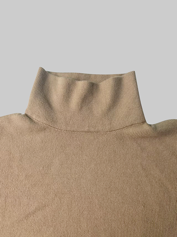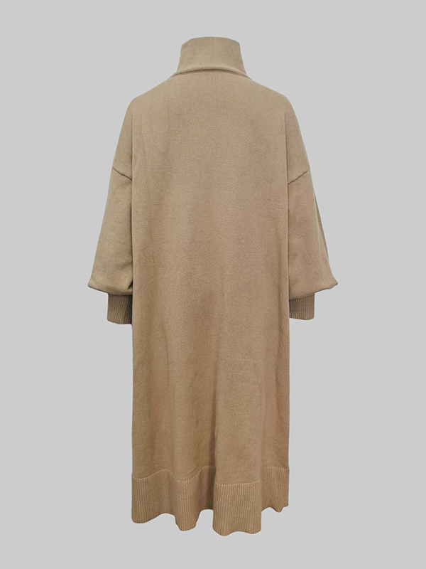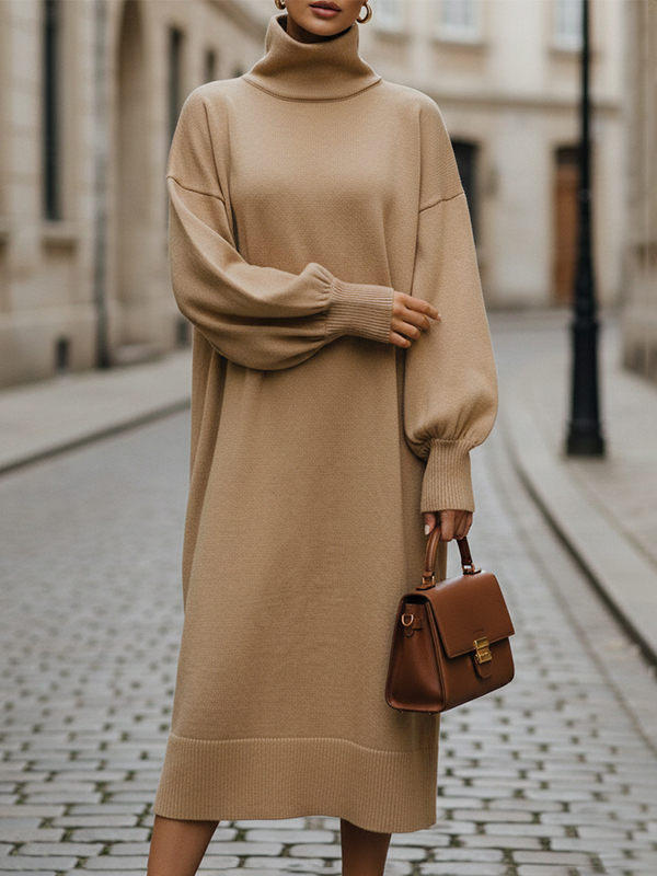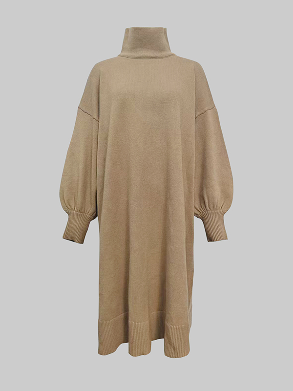Solid Color Puff Sleeves Loose High Neck Sweater Dresses Midi Dresses