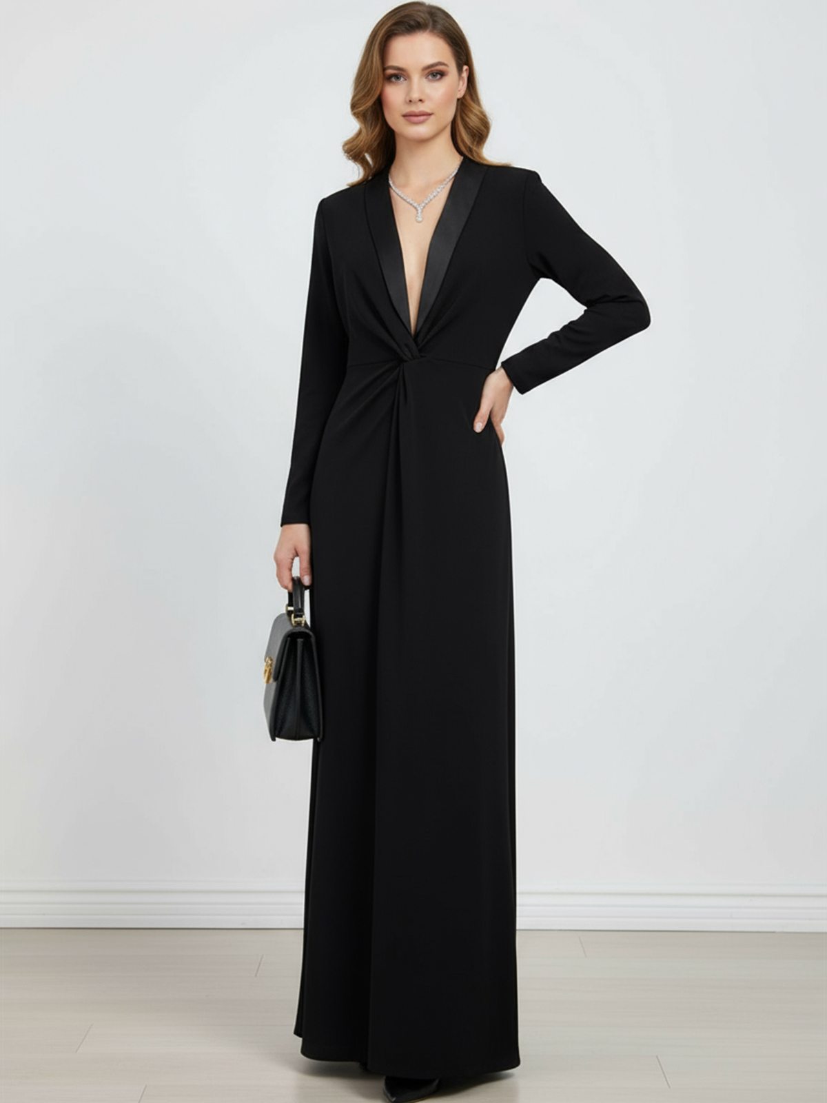 Long Sleeves Skinny Solid Color Deep V-Neck Maxi Dresses