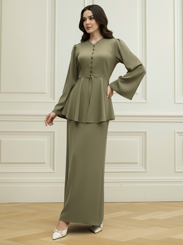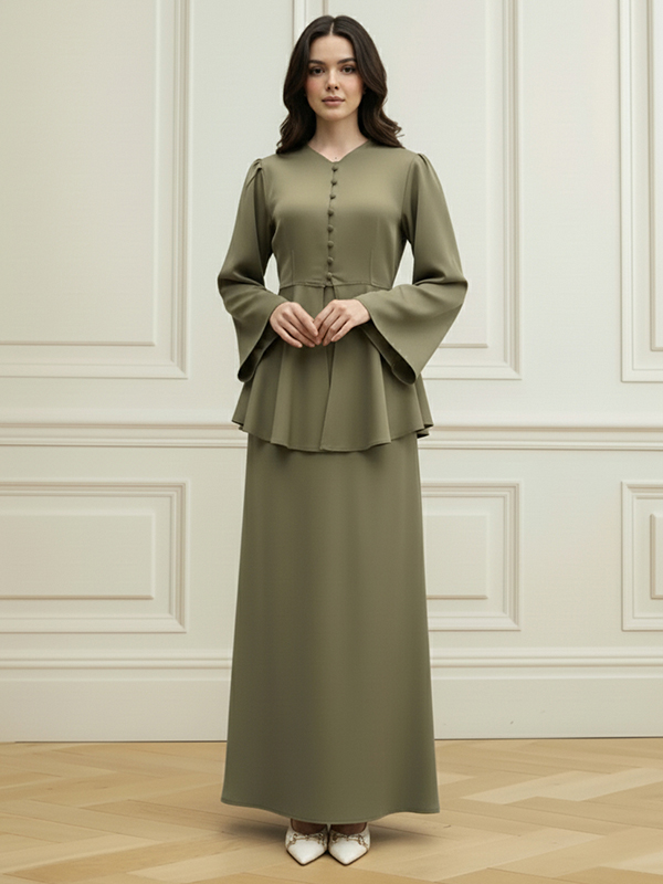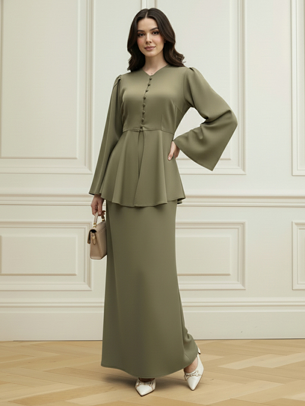 Solid Color V-Neck Ruffled Long Sleeves Flared Sleeves Buttoned Blouses&Shirts Tops + Zipper Adjustable Straps Maxi Dresses Two Pieces Set