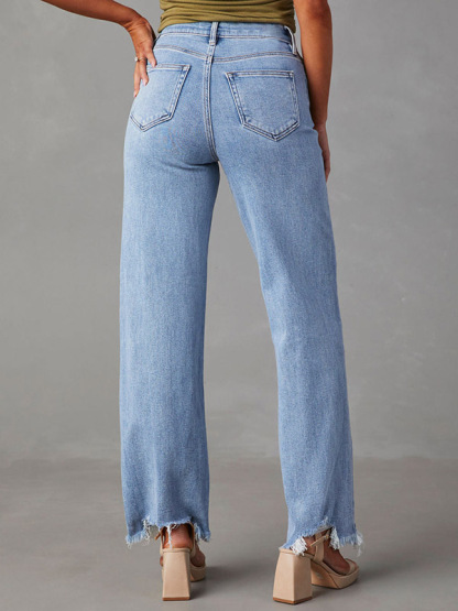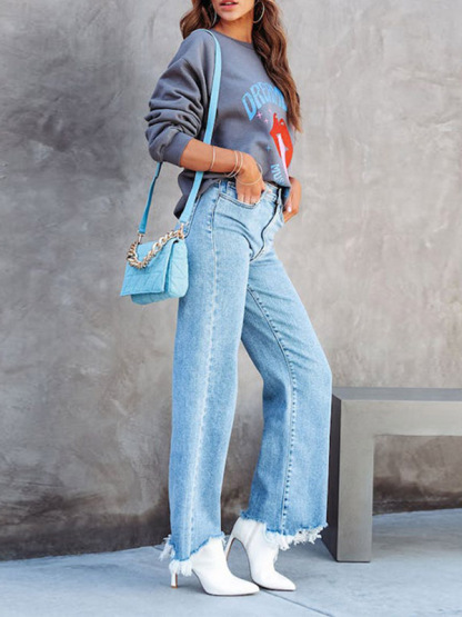 Split-Joint Fringed Straight Leg High Waisted Jean Pants Bottoms