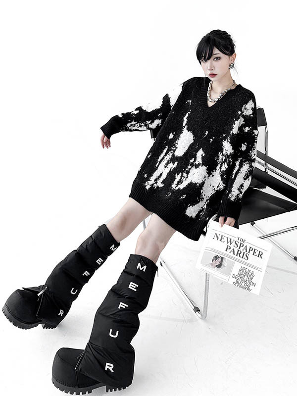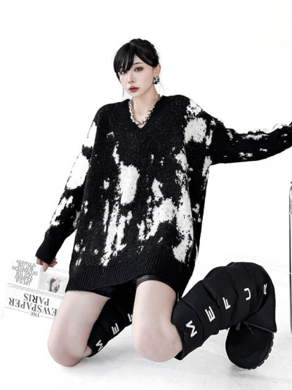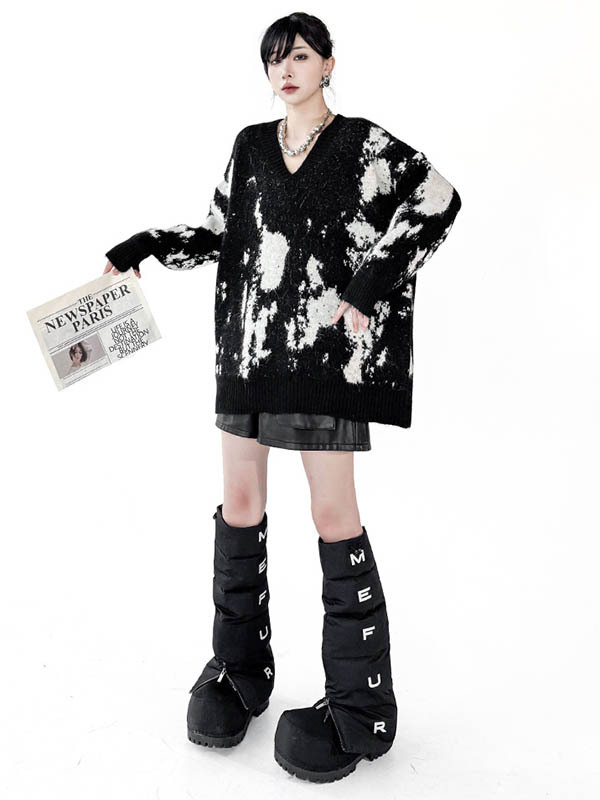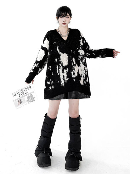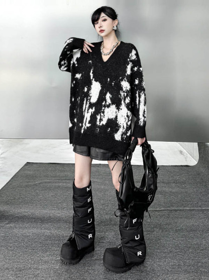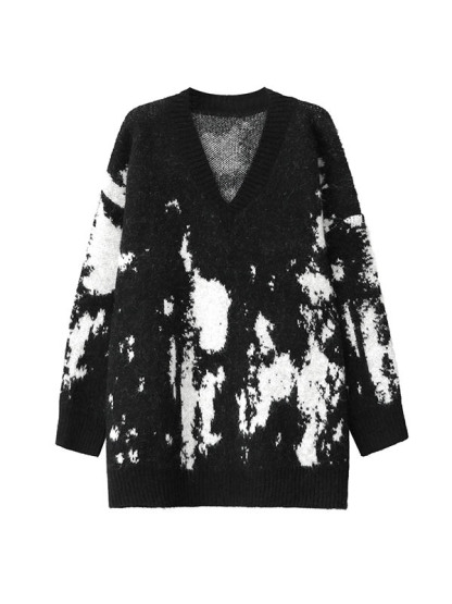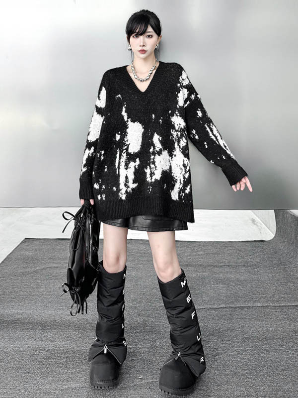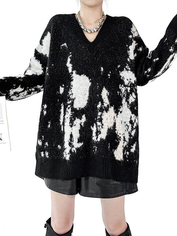 Split-Joint Ribs Contrast Color Abstract Printed Loose Long Sleeves V-Neck Sweater Tops
