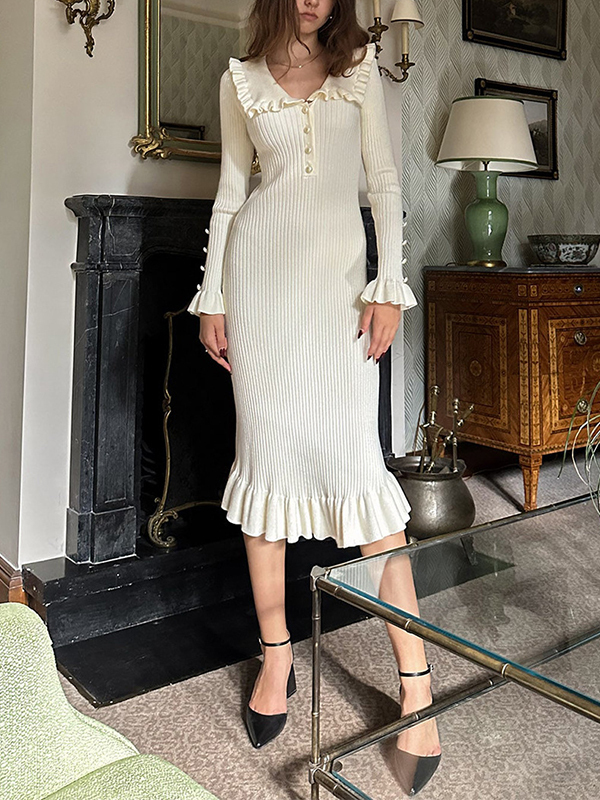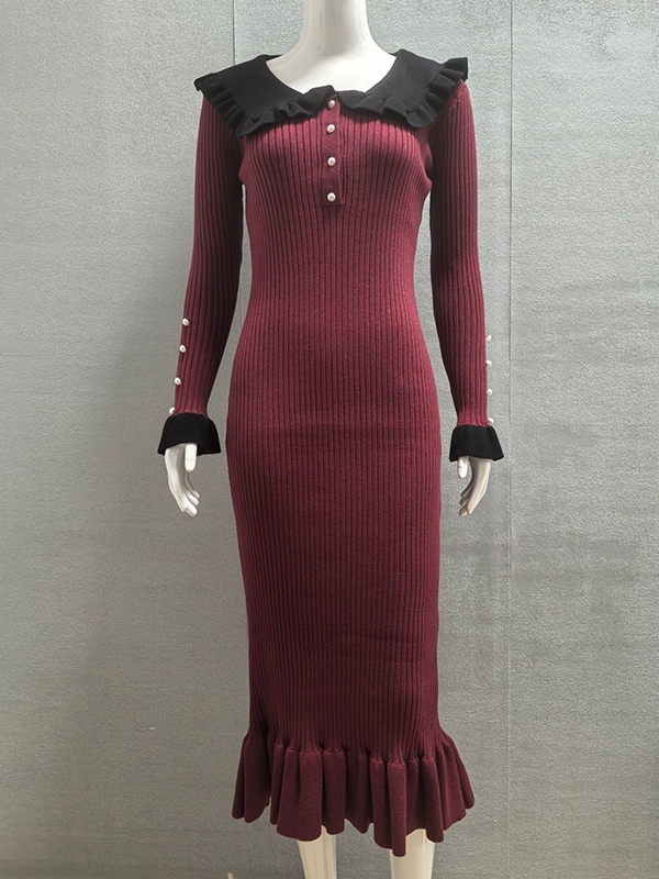 Split-Joint Ruffled Pleated Long Sleeves Peter Pan Collar Sweater Dresses Midi Dresses