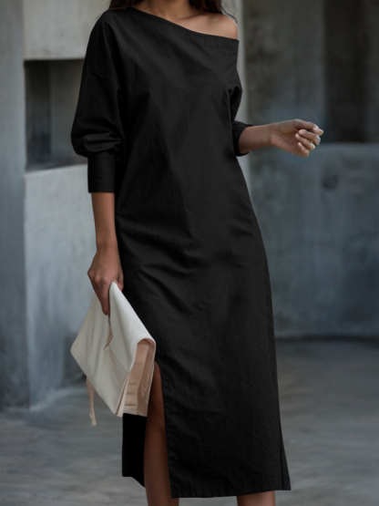 Split-Side Solid Color Loose Long Sleeves One-Shoulder Midi Dresses