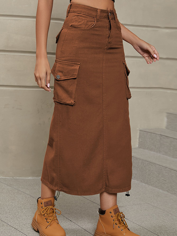 Split-Side Solid Color Pockets Drawstring Buttoned A-Line Skirts Bottoms