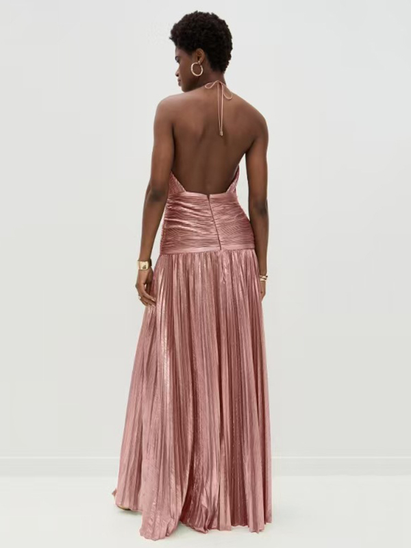 Split-Side Solid Color Shiny Pleated Sleeveless Elasticated Waist Halter-Neck Maxi Dresses