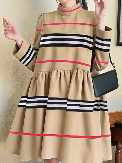 A-Line High Waisted Contrast Color Pleated Striped Zipper Mock Neck Midi Dresses