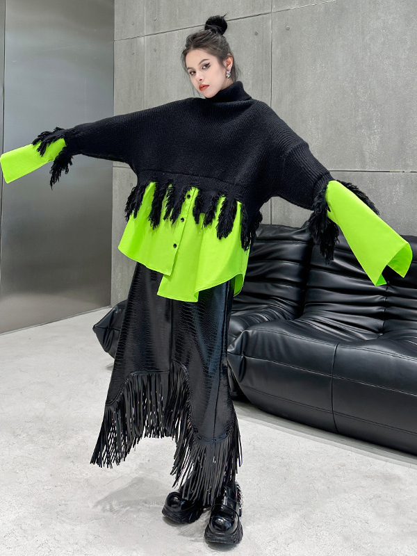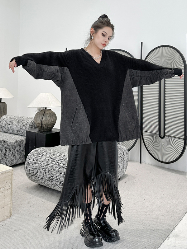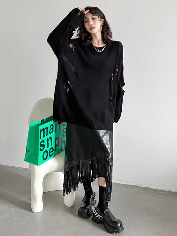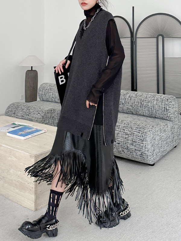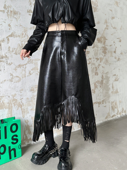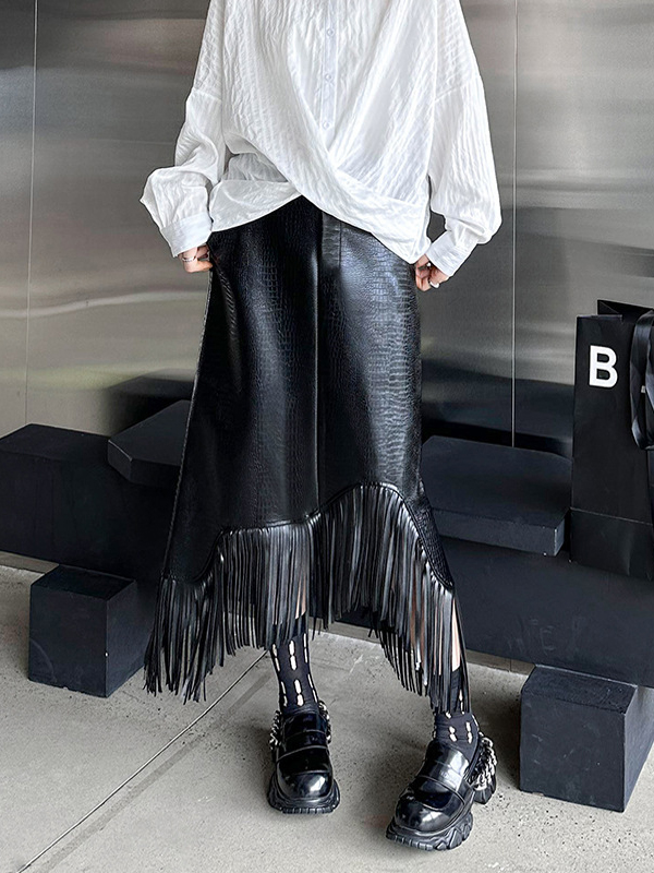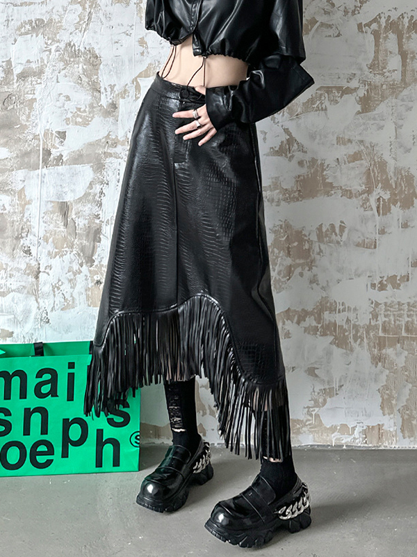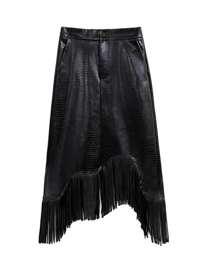 Tasseled Solid Color Crocodile Texture Buttoned Asymmetric Irregularity A-Line Skirts Bottoms