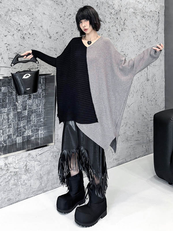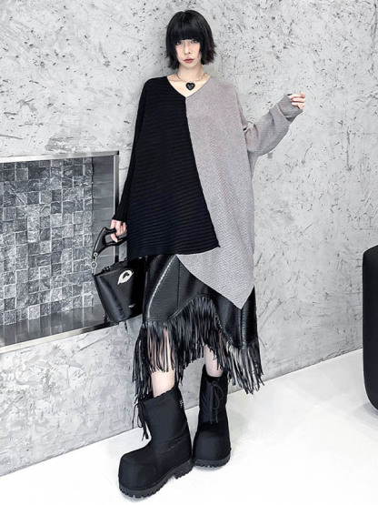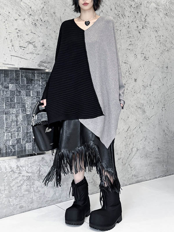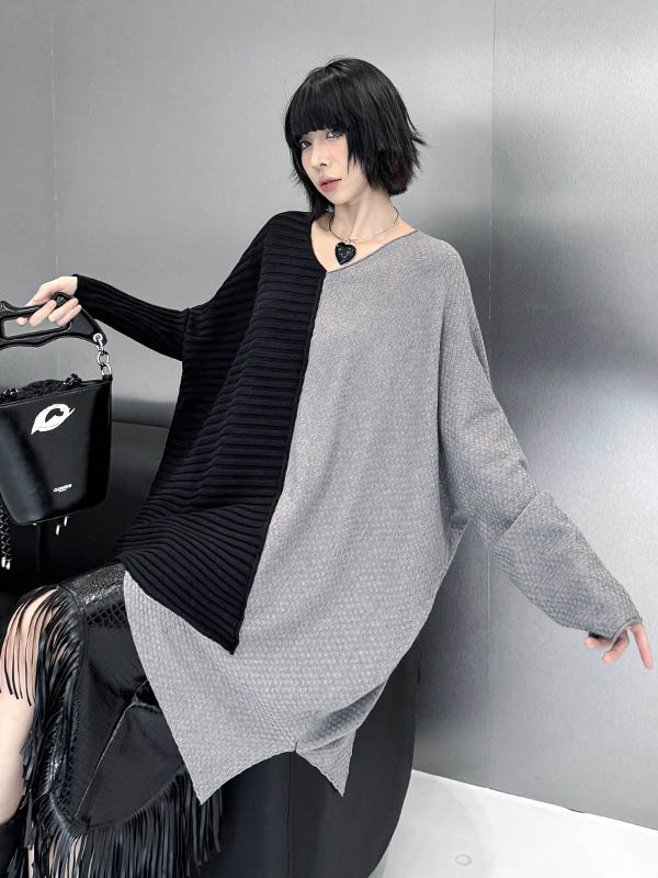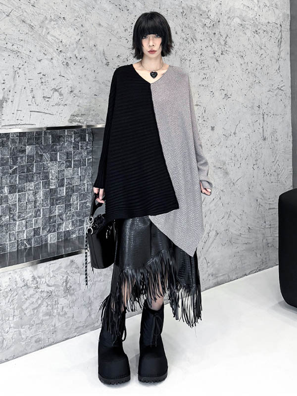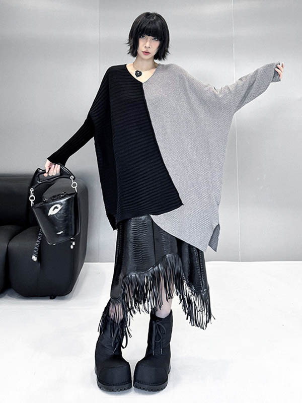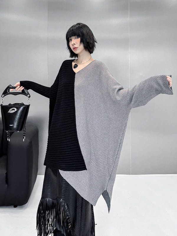 Textured Split-Joint Contrast Color Asymmetric Loose Long Sleeves V-Neck Sweater Tops