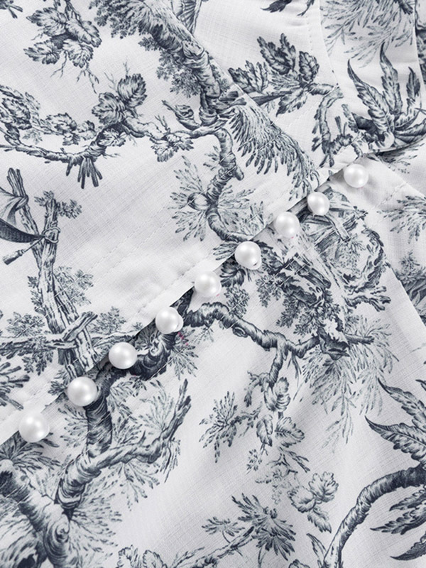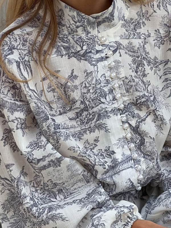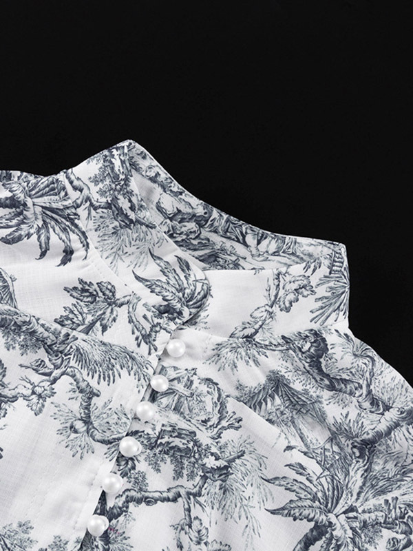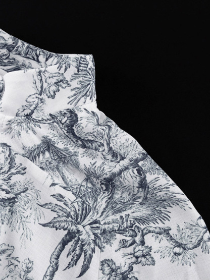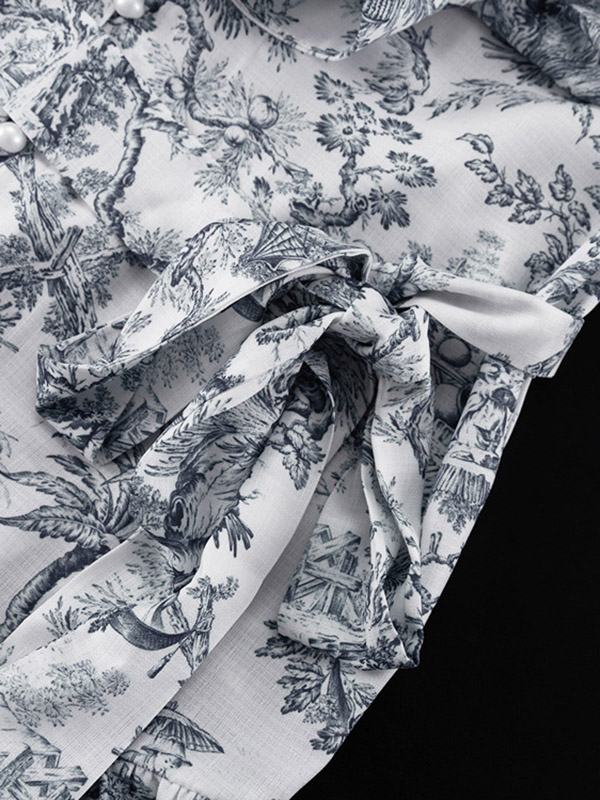 Tied Waist Split-Joint Printed Pleated Puff Sleeves Loose Stand Collar Mini Dresses