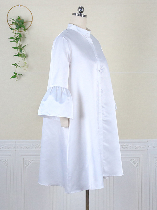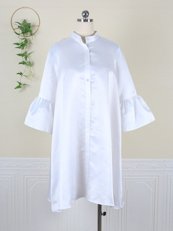 Urban Buttoned Solid Color Stand Collar Flared Sleeve Loose Midi Dress