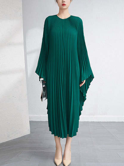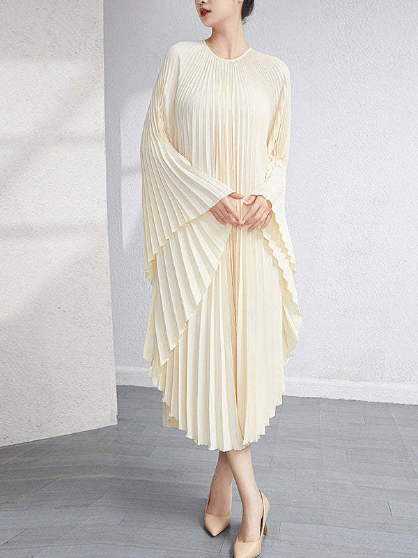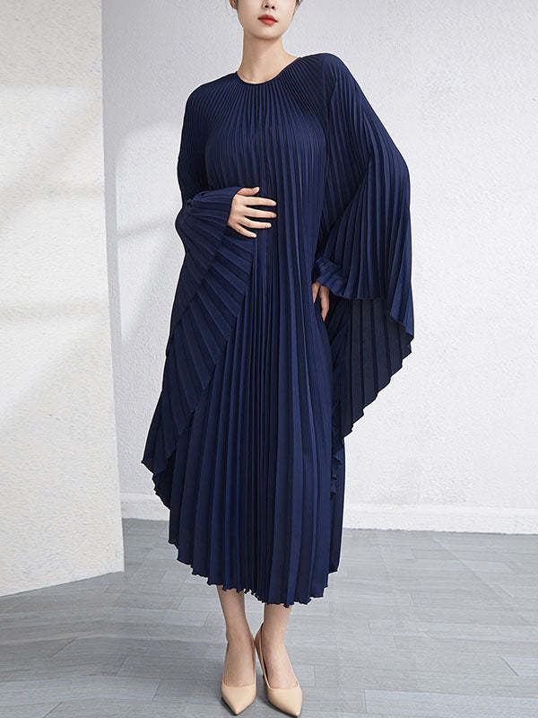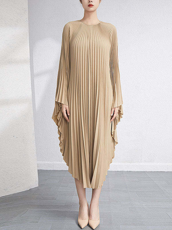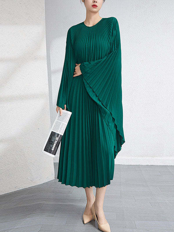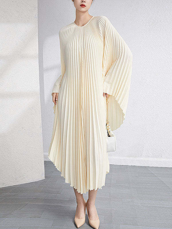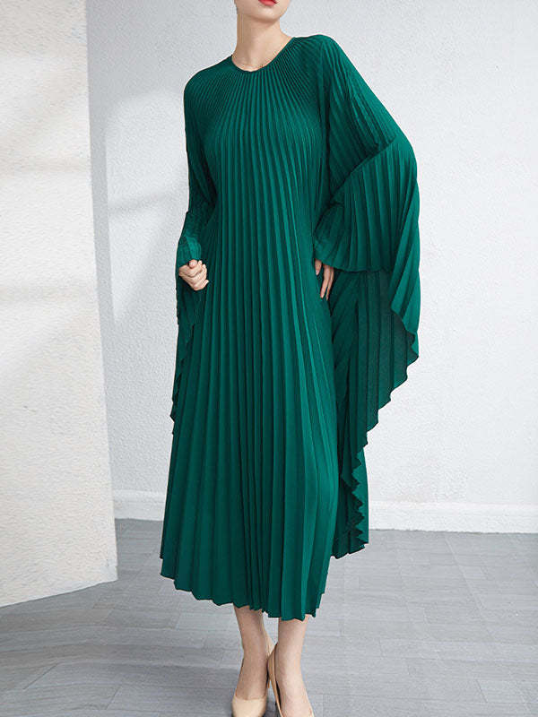 Urban Flared Batwing Sleeves Pleated Solid Color Round-Neck Midi Dresses