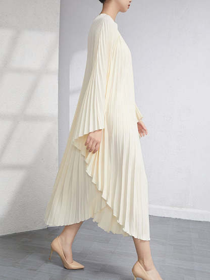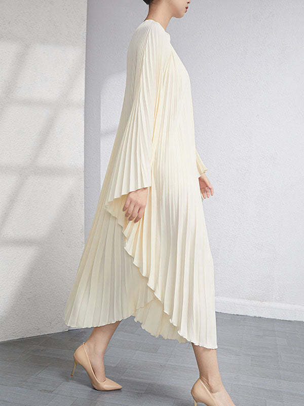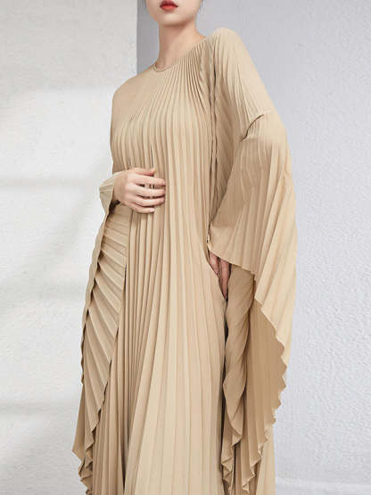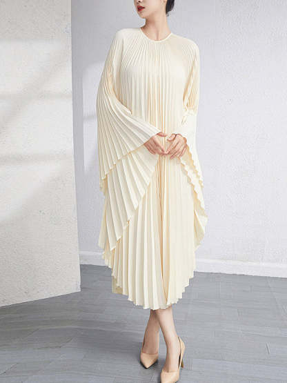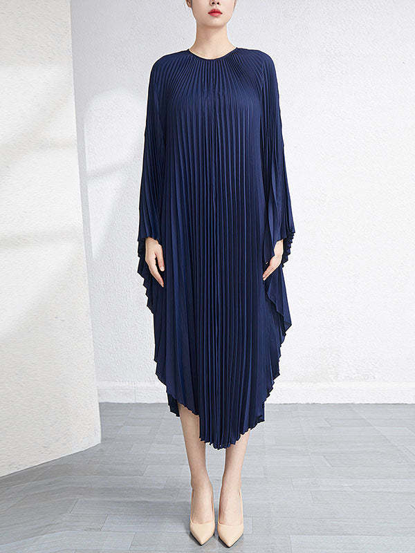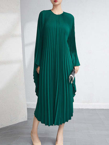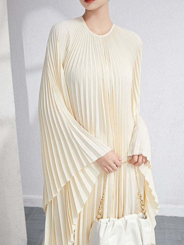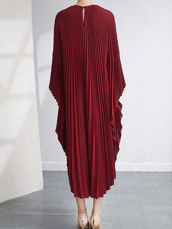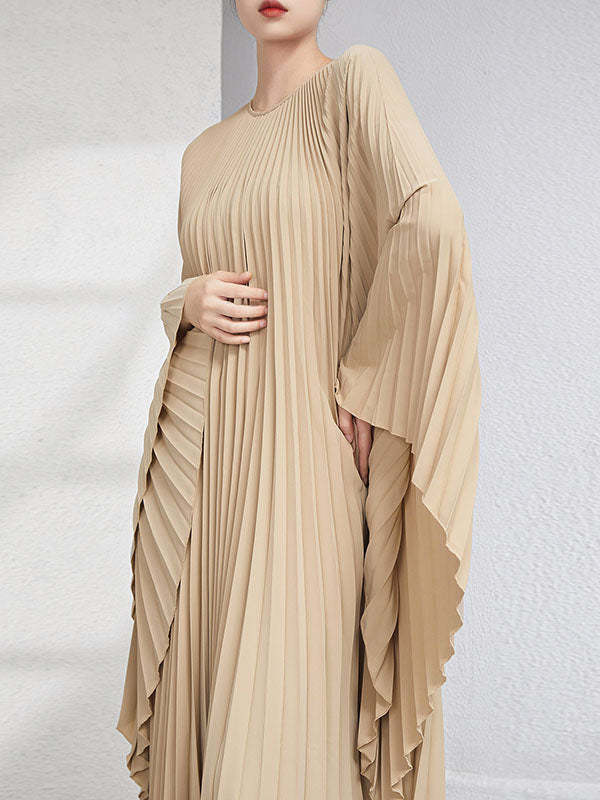 Urban Flared Batwing Sleeves Pleated Solid Color Round-Neck Midi Dresses