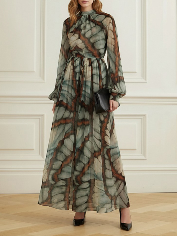 Balloon Sleeves Long Sleeves Big Hemline Contrast Color Pleated Print Zipper Stand Collar Maxi Dresses