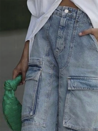 Zipper Solid Color Pockets Buttoned Loose Shorts Bottoms Denim Shorts